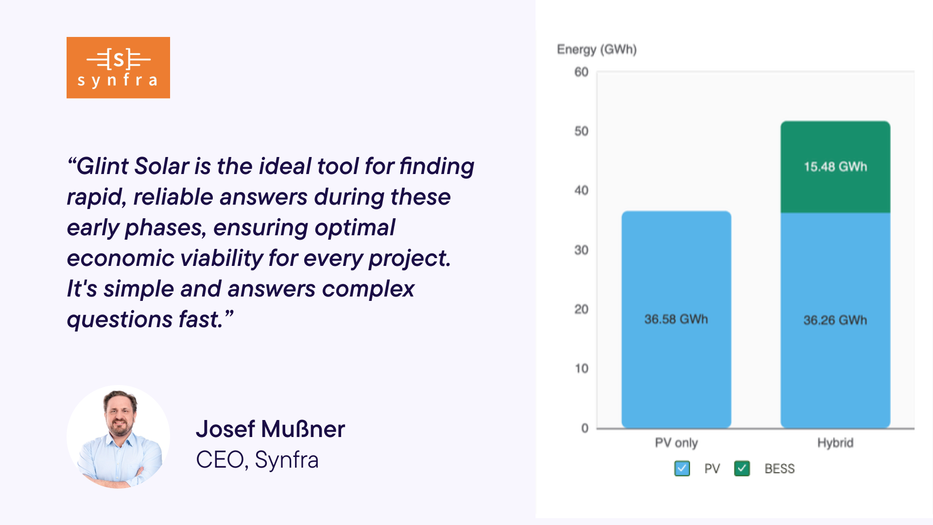 "Even in the early stages of project development, today's developers must address technical design questions, specifically the critical ratio between PV output, BESS power, and BESS capacity. In an era of scarce grid connection capacity, these are the decisions that define a project's future. Glint Solar is the ideal tool for finding rapid, reliable answers during these early phases, ensuring optimal economic viability for every project. It's simple and fast answers to complex questions." - Josef Mußner, CEO of Synfra